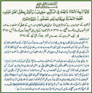 Tafseer of Ayat 36. They the chiefs of Firaun kingdom said to him : "Keep him Musa PBUH and his brother in suspense (for a while), and dispatch to the Cities heralds to collect sorcerers to teach them lesson - 37. "And bring up to thee all (our) sorcerers well versed." 38. So the sorcerers were got together for the appointment of a day well-known, A day well-known: a solemn day of festival: see 20:59 . The object was to get together as large a concourse of people as possible. It was confidently expected that the Egyptian sorcerers with all their organization would win with their tricks against these amateur Israelites, and so the State cult of the worship of Pharaoh would be fastened on the necks of the people more firmly than ever.